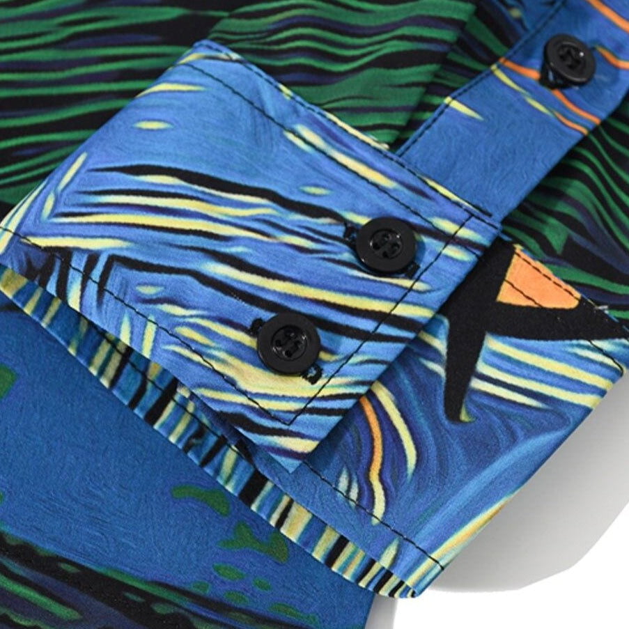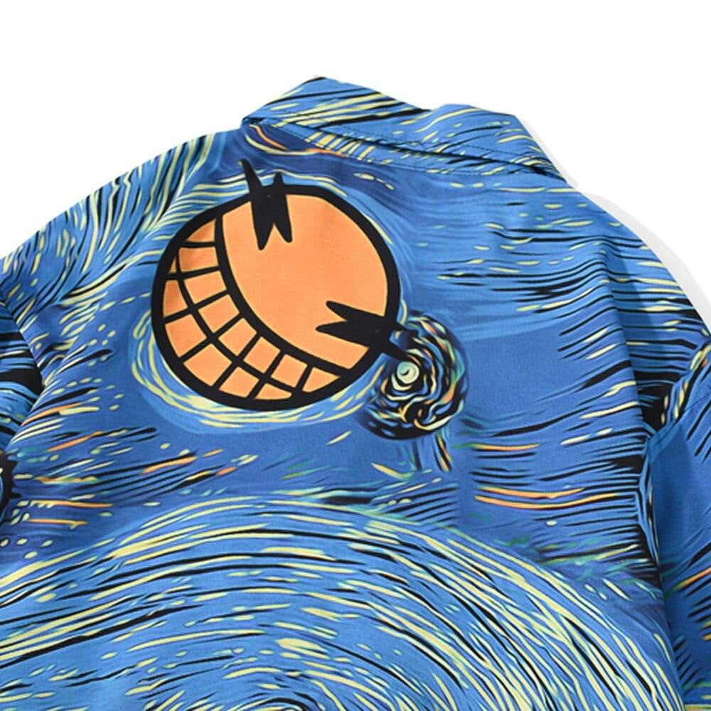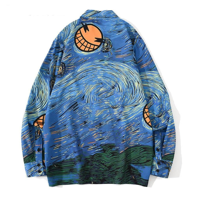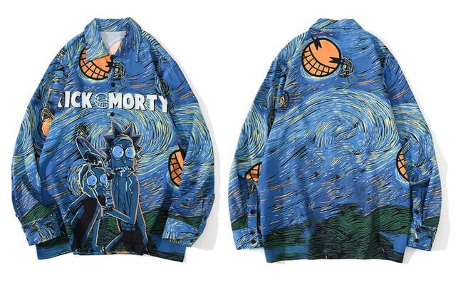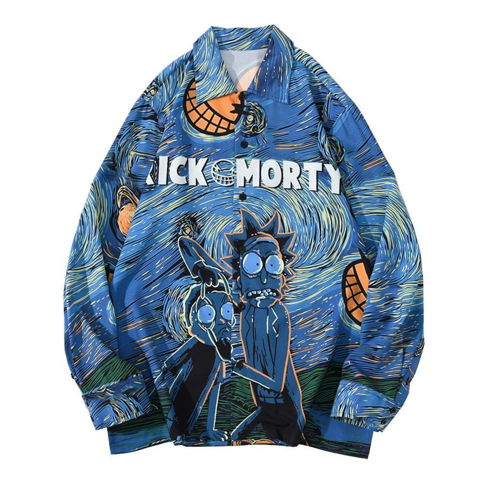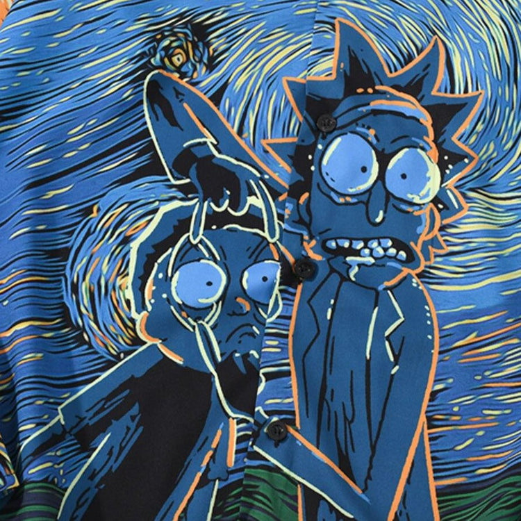 This shirt features a unique mashup of Rick and Morty characters with the famous "Starry Night" painting by Vincent van Gogh, creating a perfect blend of iconic characters and classic artwork.