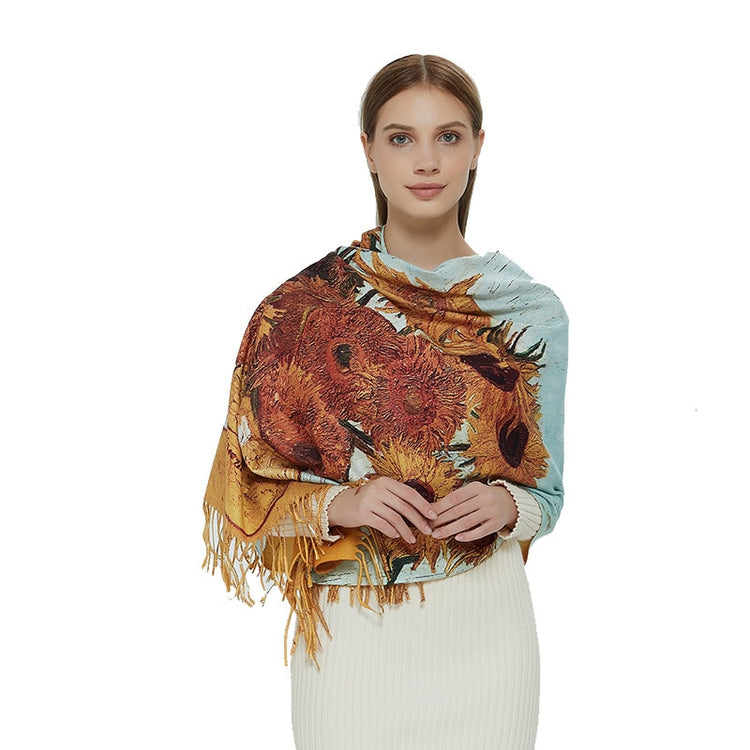 Our Van Gogh Sunflowers scarf measures a generous 70 x 200cm and is the perfect Van Gogh gift idea for fans of Sunflowers! Our light, airy Sunflowers scarf can be worn draped or tied in a variety of ways and the quality of the fine fabric makes it perfect for wearing as a light shawl.